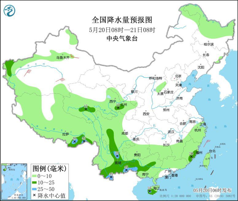 5月20日8時至21日8時,西藏北部、青海南部的部分地區有小到中雪或雨夾雪;雲(yun) 南中東(dong) 部和南部、四川南部、廣西西部和中部、福建東(dong) 部、海南島等地的部分地區有中雨,局地大雨(25~45毫米)。新疆南疆盆地等地的部分地區有4~6級風。