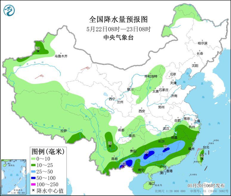5月22日8時至23日8時,新疆伊犁河穀、四川南部、雲(yun) 南南部、貴州南部、湖南中南部、江西大部、浙江南部、廣西大部、廣東(dong) 中北部、福建大部等地部分地區有中到大雨,其中,雲(yun) 南東(dong) 南部、廣西西北部和東(dong) 北部等地部分地區有暴雨或大暴雨(100~110毫米)。新疆南疆盆地和東(dong) 部等地部分地區有4~6級風。