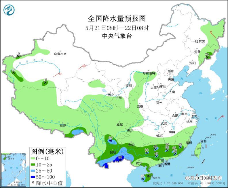 5月21日8時至22日8時,西藏東(dong) 南部、雲(yun) 南中東(dong) 部和南部、四川南部、貴州西南部、湖南南部、江西南部、廣西中北部和南部沿海、廣東(dong) 中北部、福建南部、海南島等地部分地區有中到大雨,其中,雲(yun) 南南部等地部分地區有暴雨(50~90毫米)。黑龍江東(dong) 北部、新疆南疆盆地等地部分地區有4~6級風,其中,新疆南疆盆地部分地區有6~7級風。