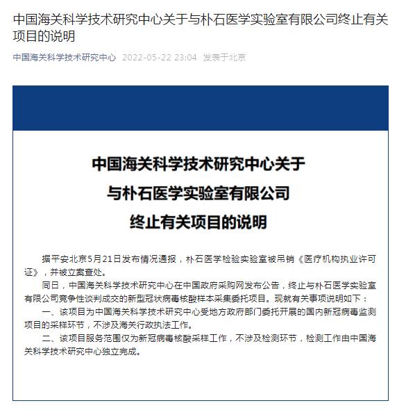 中新網5月23日電 中國海關(guan) 科學技術研究中心22日在其微信公眾(zhong) 號發布關(guan) 於(yu) 與(yu) 樸石醫學實驗室有限公司終止有關(guan) 項目的說明稱,據平安北京5月21日發布情況通報,樸石醫學檢驗實驗室被吊銷《醫療機構執業(ye) 許可證》,並被立案查處。同日,中國海關(guan) 科學技術研究中心在中國政府采購網發布公告,終止與(yu) 樸石醫學實驗室有限公司競爭(zheng) 性談判成交的新型冠狀病毒核酸樣本采集委托項目。