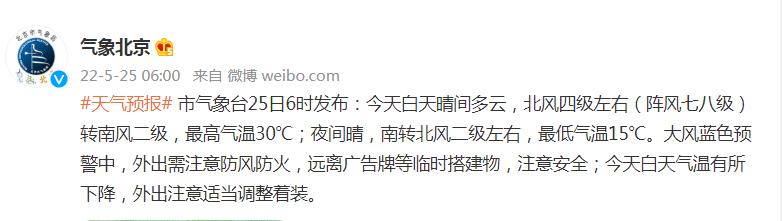 中新網5月25日電 據北京市氣象局官方微博消息,北京市氣象台25日6時發布:今天白天晴間多雲(yun) ,北風四級左右(陣風七八級)轉南風二級,最高氣溫30℃;夜間晴,南轉北風二級左右,最低氣溫15℃。大風藍色預警中,外出需注意防風防火,遠離廣告牌等臨(lin) 時搭建物,注意安全;今天白天氣溫有所下降,外出注意適當調整著裝。