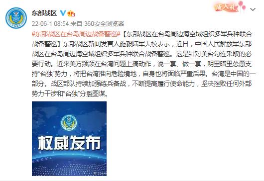 中新網6月1日電 據中國人民解放軍(jun) 東(dong) 部戰區官方微博1日消息,東(dong) 部戰區新聞發言人施毅陸軍(jun) 大校表示,近日,中國人民解放軍(jun) 東(dong) 部戰區在台島周邊海空域組織多軍(jun) 兵種聯合戰備警巡。這是針對美台勾連采取的必要行動。近來美方頻頻在台灣問題上搞動作,說一套、做一套,明裏暗裏慫恿支持“台獨”勢力,將把台灣推向危險境地,自身也將麵臨(lin) 嚴(yan) 重後果。台灣是中國的一部分。戰區部隊持續加強練兵備戰,不斷提高履行使命能力,堅決(jue) 挫敗任何外部勢力幹涉和“台獨”分裂圖謀。