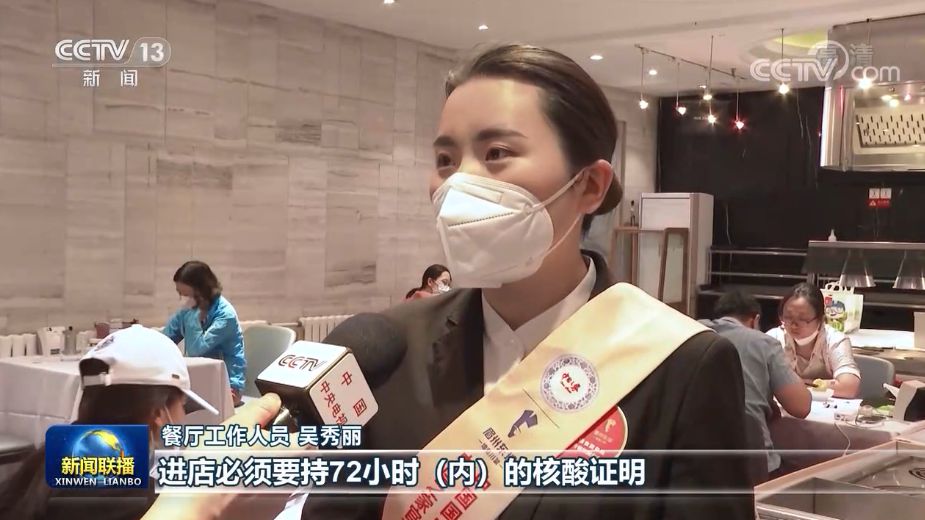 餐廳工作人員 吳秀麗(li) :進店必須要持72小時(內(nei) )的核酸證明,隔餐(桌)坐,不是桌桌都可以坐。
