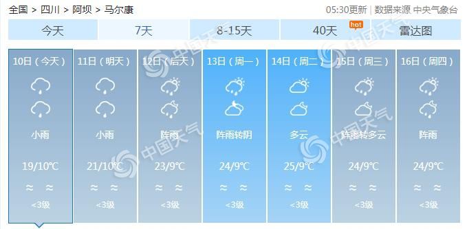 中央氣象台預計,今起三天,馬爾康市多降雨,其中今明天有小雨,後天有陣雨。早晚氣溫較低,最低氣溫在10℃左右,最高氣溫19~23℃。