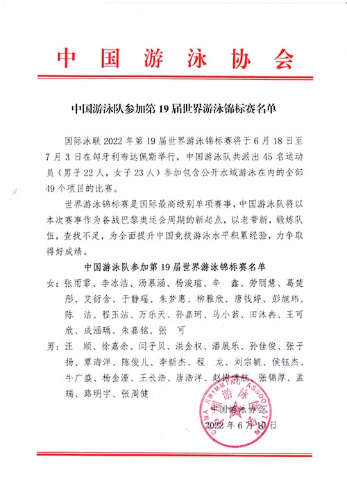 中新網客戶端北京6月10日電 6月10日,中國遊泳協會(hui) 網站公布了中國遊泳隊參加國際泳聯2022年第19屆世界遊泳錦標賽名單,奧運冠軍(jun) 張雨霏、汪順領銜出戰。