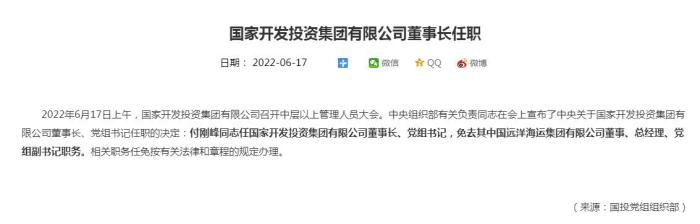 中新財經6月17日電 國家開發投資集團有限公司網站6月17日消息,2022年6月17日上午,國家開發投資集團有限公司召開中層以上管理人員大會(hui) 。中央組織部有關(guan) 負責同誌在會(hui) 上宣布了中央關(guan) 於(yu) 國家開發投資集團有限公司董事長、黨(dang) 組書(shu) 記任職的決(jue) 定:付剛峰同誌任國家開發投資集團有限公司董事長、黨(dang) 組書(shu) 記,免去其中國遠洋海運集團有限公司董事、總經理、黨(dang) 組副書(shu) 記職務。相關(guan) 職務任免按有關(guan) 法律和章程的規定辦理。(完)