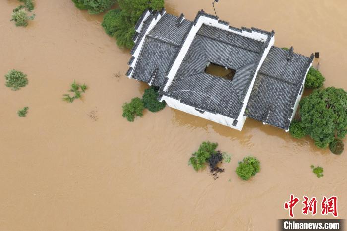 圖為(wei) 6月20日,航拍江西省婺源縣沿江受淹的房屋。 詹東(dong) 華 攝