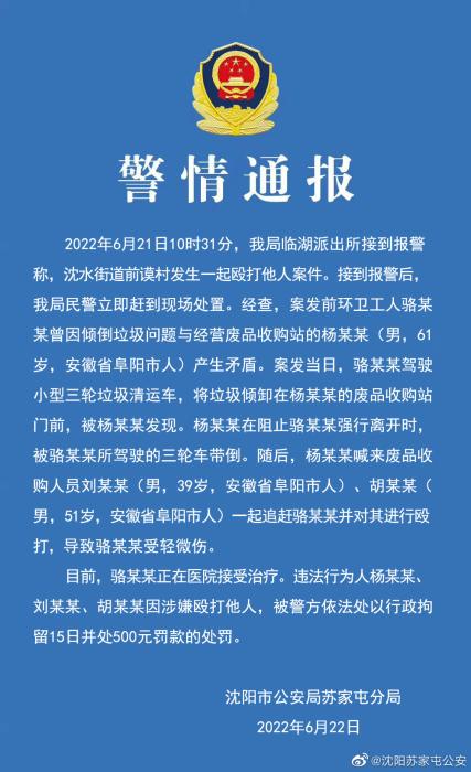 中新網6月23日電 據遼寧省沈陽市公安局蘇家屯分局官方微博消息,6月21日10時31分,該局臨(lin) 湖派出所接到報警稱,沈水街道前謨村發生一起毆打他人案件。經查,案發前環衛工人駱某某曾因傾(qing) 倒垃圾問題與(yu) 經營廢品收購站的楊某某(男,61歲,安徽省阜陽市人)產(chan) 生矛盾。