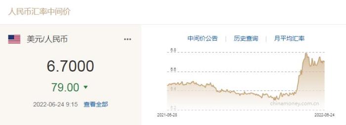 中新財經6月24日電 中國人民銀行授權中國外匯交易中心公布,2022年6月24日銀行間外匯市場人民幣匯率中間價(jia) 為(wei) :1美元對人民幣6.7000元。這較上一交易日上調79個(ge) 基點。(完)