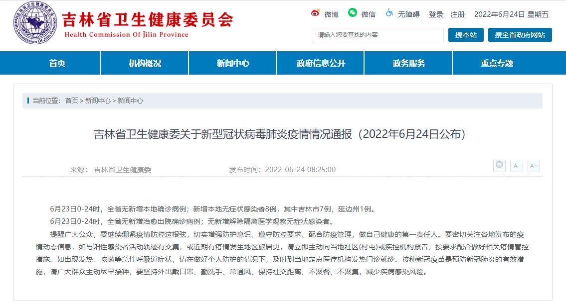 中新網6月24日電 據吉林省衛健委網站消息,6月23日0-24時,全省無新增本地確診病例;新增本地無症狀感染者8例,其中吉林市7例,延邊州1例。