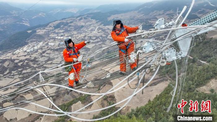 電力工人曾坤銀和熊誌偉(wei) 正在進行高空作業(ye) 。 盧忠東(dong) 攝