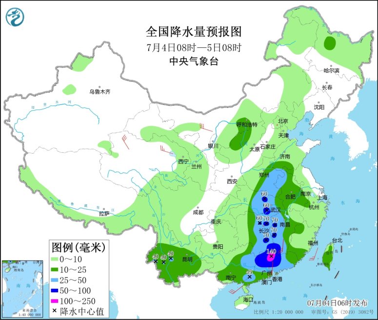 7月4日08時至5日08時,廣東(dong) 大部、廣西東(dong) 部、湖南中東(dong) 部、江西西部和南部、湖北中部、河南東(dong) 部等地部分地區有大到暴雨,其中,廣東(dong) 北部等地部分地區有大暴雨(100~140毫米)。內(nei) 蒙古西部、甘肅西部、青海北部、東(dong) 北地區南部、江南中部、華南東(dong) 部等地的部分地區有4~6級風;東(dong) 海北部海域有6~7級、陣風8級的旋轉風,東(dong) 海南部海域、台灣海峽、北部灣、南海北部和中部海域有5~6級、陣風7級的偏南到西南風。