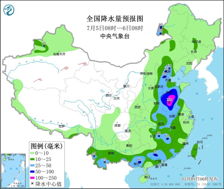 7月5日08時至6日08時,內(nei) 蒙古中東(dong) 部、京津冀、黃淮中東(dong) 部、西南地區南部、江淮大部、江漢東(dong) 部、江南中東(dong) 部、華南大部、台灣島等地的部分地區有中到大雨,其中,山東(dong) 中南部、河南東(dong) 部、安徽北部、江蘇北部、京津冀、廣東(dong) 北部等地的部分地區有暴雨,山東(dong) 南部、安徽北部、江蘇北部、河南東(dong) 部等地局地大暴雨(100~180毫米)。新疆北部和東(dong) 部、內(nei) 蒙古西部、甘肅西部、東(dong) 北地區南部、山東(dong) 半島、江南東(dong) 部等地的部分地區有4~6級風,其中,新疆東(dong) 部、浙江東(dong) 部等地的部分地區風力可達7級以上;東(dong) 海大部海域、台灣海峽、北部灣有5~6級、陣風7級的偏南到西南風。