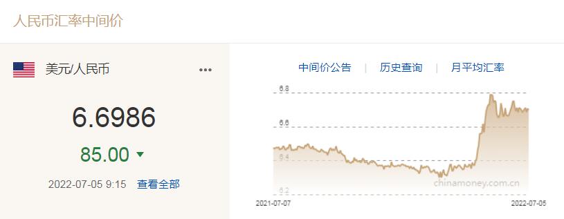 中新網7月5日電 中國人民銀行授權公布,2022年7月5日銀行間外匯市場人民幣匯率中間價(jia) 為(wei) 1美元對人民幣6.6986元。這較上一交易日上調85個(ge) 基點。(中新財經)