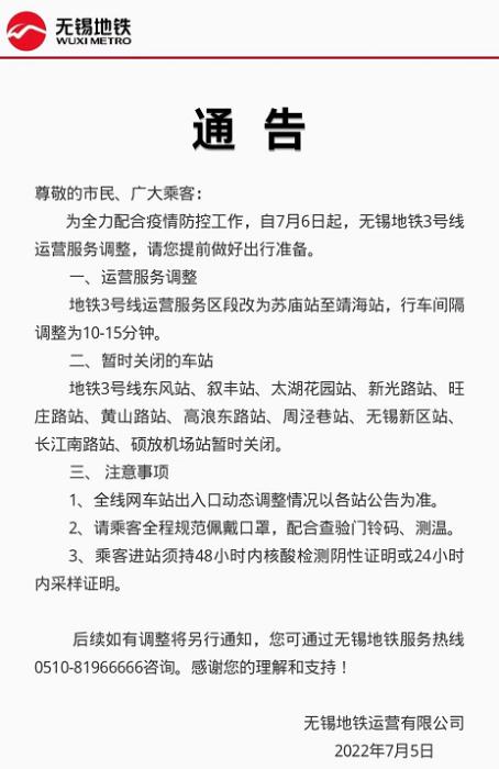 中新網7月6日電 據江蘇無錫地鐵官方微博消息,為(wei) 全力配合疫情防控工作,自7月6日起,無錫地鐵3號線運營服務調整。