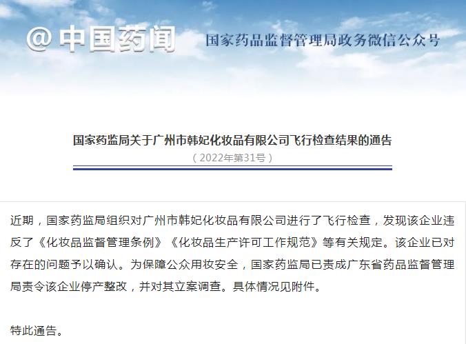 國家藥監局:對廣州市韓妃化妝品有限公司立案調查