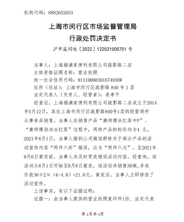 行政處罰決(jue) 定書(shu) 顯示,當事人在銷售冰紅茶時,兩(liang) 種產(chan) 品的標價(jia) 均為(wei) 4元。2021年8月1日,當事人接到公司微信群稱關(guan) 於(yu) 部分產(chan) 品的活動宣傳(chuan) 內(nei) 容“兩(liang) 件六折”錯誤,應為(wei) “兩(liang) 件六元”。至2021年8月6日案發前,當事人未及時更改錯誤活動內(nei) 容。經查詢,該活動從(cong) 8月1日開始至8月6日案發,該活動共銷售36瓶,多收價(jia) 款36÷2×(6-4.8)=21.6元。案發後,當事人立即修改了活動宣傳(chuan) 。(中新財經)