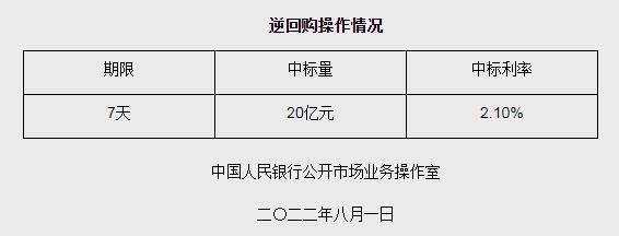 央行8月1日開展20億元逆回購操作 中標利率2.10%