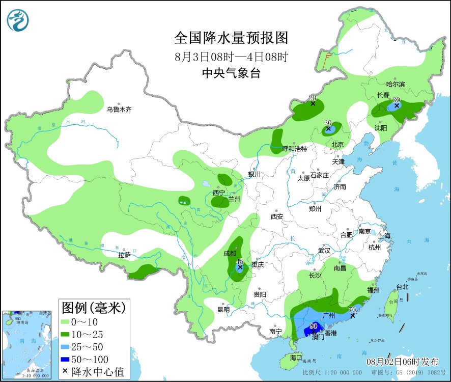 8月3日08時至4日08時,內(nei) 蒙古中部、河北北部、吉林東(dong) 部、遼寧北部、四川盆地西部和南部、廣西東(dong) 部、廣東(dong) 大部、福建東(dong) 南部等地部分地區有中到大雨,其中,廣東(dong) 西南部和東(dong) 部沿海等地部分地區有暴雨(50~90毫米)。內(nei) 蒙古東(dong) 北部部分地區有4~5級風。