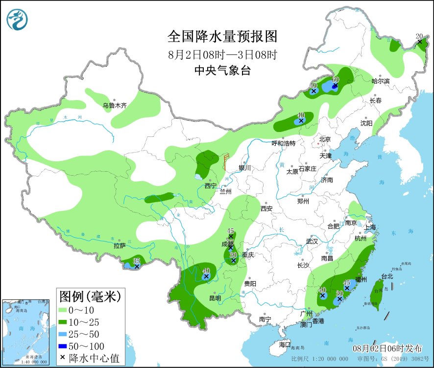 8月2日08時至3日08時,青海北部和南部、內(nei) 蒙古中東(dong) 部、黑龍江東(dong) 北部、四川中部和南部、雲(yun) 南西部、江西東(dong) 南部、浙江東(dong) 南部、福建東(dong) 部和南部、廣東(dong) 東(dong) 部、台灣島等地部分地區有中到大雨,局地暴雨(50~60毫米)。內(nei) 蒙古西部部分地區有4~5級風。