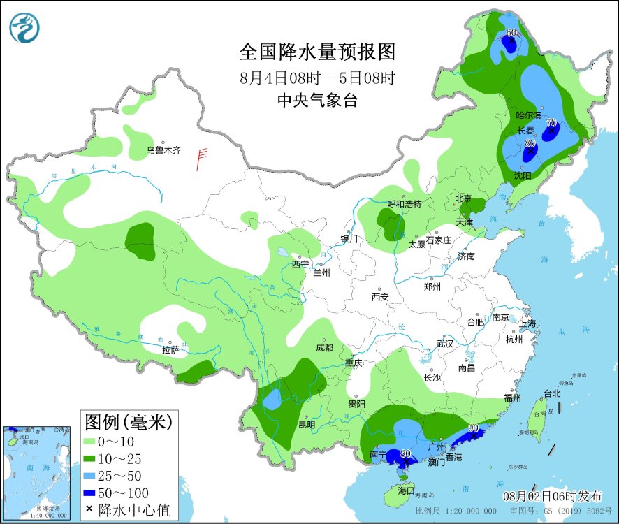 8月4日08時至5日08時,內(nei) 蒙古東(dong) 北部、東(dong) 北地區大部、四川南部、雲(yun) 南中部和西北部、廣西大部、廣東(dong) 大部等地有中到大雨,其中,內(nei) 蒙古東(dong) 北部、黑龍江西北部和東(dong) 南部、吉林中部、遼寧北部、廣西東(dong) 南部沿海、廣東(dong) 西南部和東(dong) 部沿海等地部分地區有暴雨(50~90毫米)。黑龍江西北部部分地區有4~6級風。
