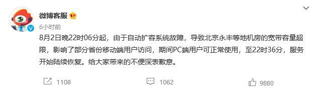 微博:2日晚自動擴容係統故障 致北京永豐等地機房寬帶容量超限