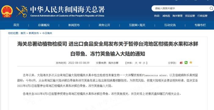 各海關(guan) 自2022年8月3日起暫停受理台灣地區柑橘類水果和冰鮮白帶魚、凍竹莢魚報關(guan) ,並及時將上述情況通知轄區內(nei) 相關(guan) 企業(ye) 。(中新財經)