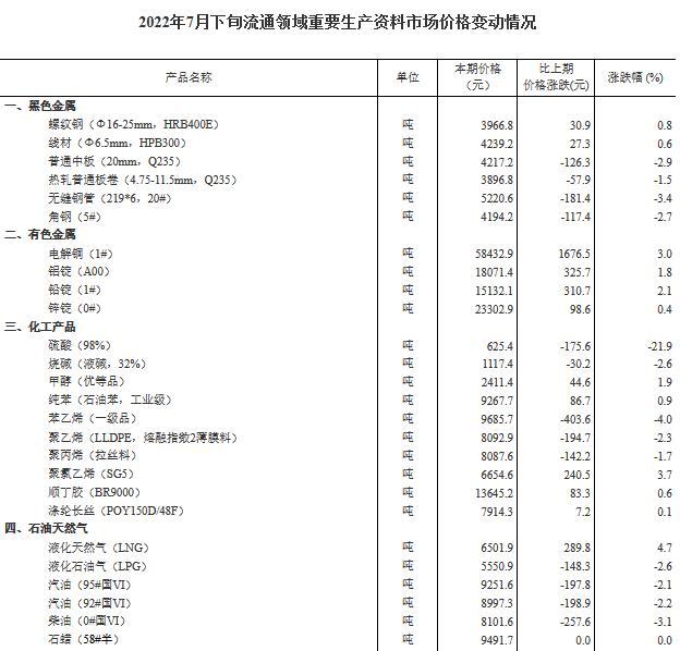 中新網8月4日電 國家統計局4日公布2022年7月下旬流通領域重要生產(chan) 資料市場價(jia) 格變動情況,據對全國流通領域9大類50種重要生產(chan) 資料市場價(jia) 格的監測顯示,2022年7月下旬與(yu) 7月中旬相比,15種產(chan) 品價(jia) 格上漲,32種下降,3種持平。