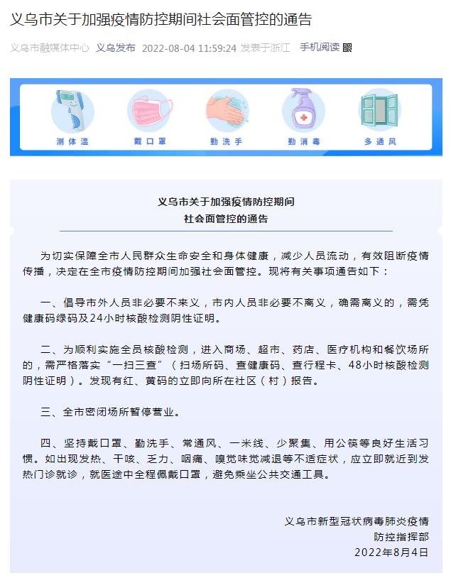 中新網8月4日電 據“義(yi) 烏(wu) 發布”微信公眾(zhong) 號消息,浙江省義(yi) 烏(wu) 市新型冠狀病毒肺炎疫情防控指揮部4日發布義(yi) 烏(wu) 市關(guan) 於(yu) 加強疫情防控期間社會(hui) 麵管控的通告。通告指出,為(wei) 切實保障全市人民群眾(zhong) 生命安全和身體(ti) 健康,減少人員流動,有效阻斷疫情傳(chuan) 播,決(jue) 定在全市疫情防控期間加強社會(hui) 麵管控。