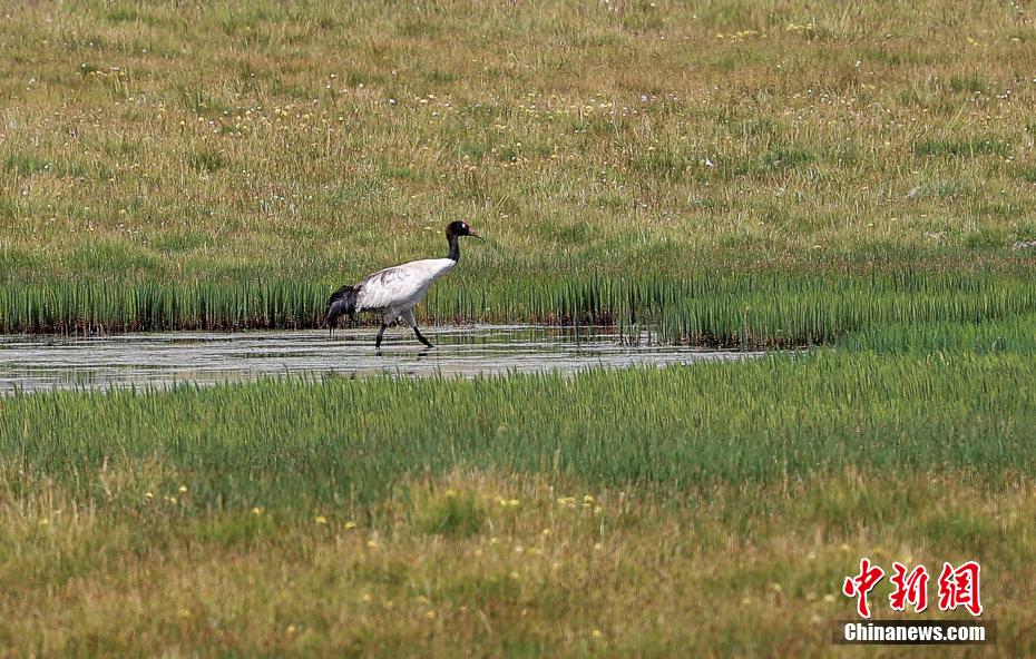 8月9日,祁連山南麓的青海省海北藏族自治州祁連縣央隆鄉(xiang) ,三隻黑頸鶴正在央隆濕地悠閑踱步,不時發出鳴叫聲。黑頸鶴是大型飛行涉禽,頸的上部為(wei) 黑色,故稱黑頸鶴。每年,黑頸鶴在春季遷徙到繁殖地,秋季到達越冬地,是世界上唯一生長、繁殖在高原的鶴。圖為(wei) 一隻悠閑踱步的黑頸鶴。 賈天勇 攝