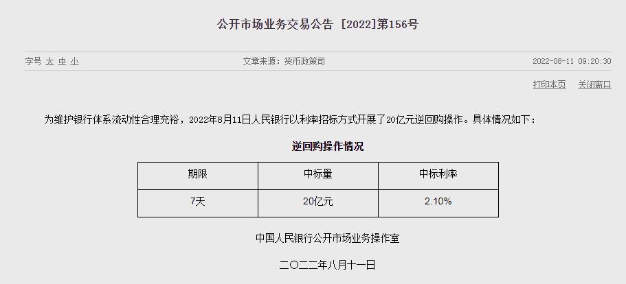 中新網8月11日電 據央行網站11日消息,為(wei) 維護銀行體(ti) 係流動性合理充裕,2022年8月11日人民銀行以利率招標方式開展了20億(yi) 元逆回購操作。中標利率為(wei) 2.10%。(中新財經)