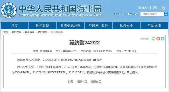 中新網8月12日電 據中國海事局網站消息,唐山海事局發布航行警告,8月12日0時至8月18日10時,渤海以39°24′35″N、119°13′44″E為(wei) 基點,正東(dong) 方向至正南偏西6°、夾角96°的扇形區域(該扇形區域的2個(ge) 頂點坐標分別為(wei) 39°24′14″N 、119°28′24″E和39°13′13″N 、119°11′51″E)內(nei) 進行實彈射擊活動,禁止駛入。
