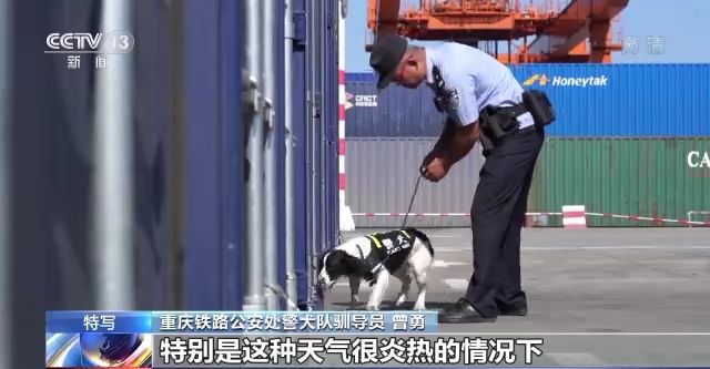 重慶鐵路公安處警犬隊馴導員 陳城:咱們(men) 警犬它散熱的方式就是通過舌頭,但是它工作的時候又要閉著嘴,用鼻子來呼吸、工作。天氣又太熱,它自身也非常難受,其實它內(nei) 心是非常煎熬的,但是咱們(men) 的警犬都非常棒,執行命令也非常強。