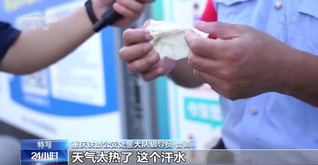 重慶鐵路公安處警犬隊馴導員 曾勇:天氣太熱了,這個(ge) 汗水。這個(ge) 手套不透氣,主要是天氣太熱了。