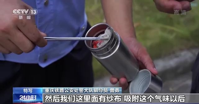 重慶鐵路公安處警犬隊馴導員 曾勇:這是我們(men) 訓練用的乳化炸藥,然後我們(men) 這裏麵有紗布,吸附這個(ge) 氣味後,就可以放在箱子裏麵,然後讓搜爆犬來進行搜尋。如果它坐下或者臥下示警的話,就表示這個(ge) 箱子裏有危險品。