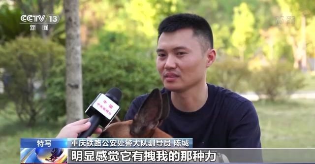 重慶鐵路公安處警犬隊馴導員 陳城:有一次我們(men) 出去找一個(ge) 人的時候,在山林裏搜救,我在行進的途中不小心差點摔下去了,因為(wei) 拽著(閃電的)警繩,明顯感覺它有拽我的那種力,把我拖上去的感覺挺感動的,當時內(nei) 心有一顫。