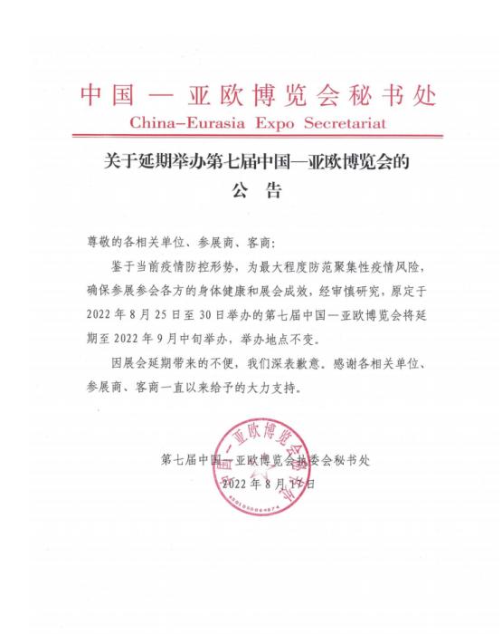 8月17日晚,第七屆中國—亞(ya) 歐博覽會(hui) 官網發布公告,宣布原定於(yu) 8月25日在烏(wu) 魯木齊舉(ju) 辦的第七屆中國—亞(ya) 歐博覽會(hui) 將延期至9月中旬舉(ju) 辦。通知內(nei) 容如下: