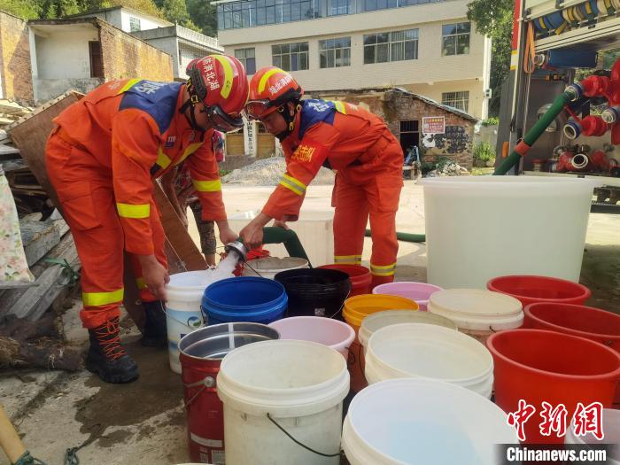因持續幹旱天氣,湖北鹹寧不少地區民眾(zhong) 生活用水告急,消防員奔赴鄉(xiang) 村送水(資料圖) 湖北鹹寧消防供圖