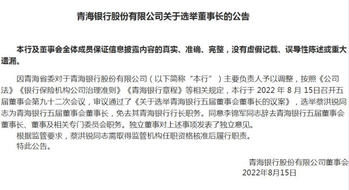 中新網8月23日電 青海銀行股份有限公司近日發布公告,因青海省委對於(yu) 該行主要負責人予以調整,該行近日召開董事會(hui) 決(jue) 議,選舉(ju) 蔡洪銳為(wei) 董事長,免去其青海銀行行長職務。同時,同意李錦軍(jun) 辭去青海銀行五屆董事會(hui) 董事長、董事及相關(guan) 專(zhuan) 門委員會(hui) 職務。(中新財經)