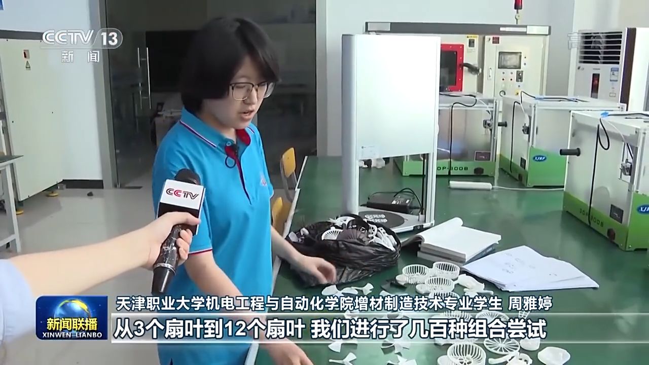 天津職業(ye) 大學機電工程與(yu) 自動化學院增材製造技術專(zhuan) 業(ye) 學生 周雅婷:這些都是我們(men) 通過3D打印打印出來的,從(cong) 3個(ge) 扇葉到12個(ge) 扇葉,我們(men) 進行了幾百種組合嚐試。如果差0.1毫米的話,可能會(hui) 導致風扇卡住。