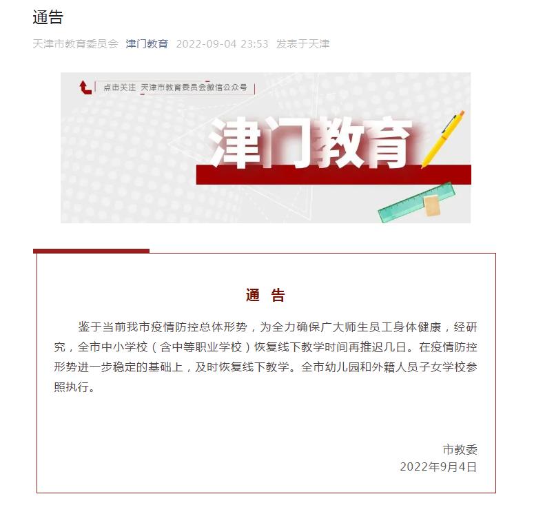 中新網9月5日電 天津市教育委員會(hui) 4日晚在其官方微信發布通告稱,鑒於(yu) 當前天津市疫情防控總體(ti) 形勢,為(wei) 全力確保廣大師生員工身體(ti) 健康,經研究,全市中小學校(含中等職業(ye) 學校)恢複線下教學時間再推遲幾日。在疫情防控形勢進一步穩定的基礎上,及時恢複線下教學。全市幼兒(er) 園和外籍人員子女學校參照執行。