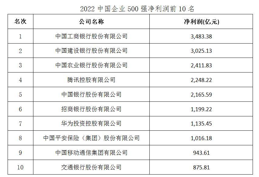淨利潤前10名為(wei) 工商銀行、建設銀行、農(nong) 業(ye) 銀行、騰訊、中國銀行、招商銀行、華為(wei) 、中國平安、中國移動、交通銀行。