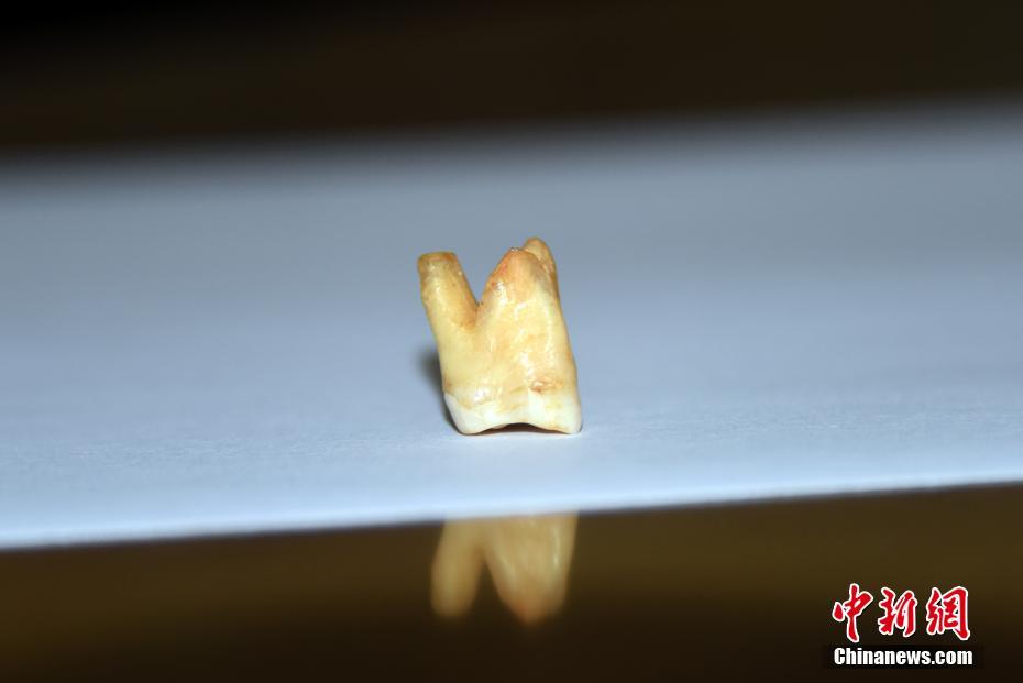 中國科學院古脊椎動物與(yu) 古人類研究所(中科院古脊椎所)青年研究員吳妍帶領的研究團隊,通過對湖南道縣福岩洞遺址出土的、迄今所知東(dong) 亞(ya) 最早現代人(8-12萬(wan) 年前)的牙齒化石進行牙結石提取與(yu) 分析,最新研究發現東(dong) 亞(ya) 最早現代人植物類食物的直接證據,並發現當時的古人類就已經有了剔牙行為(wei) 。這項重要研究發現的成果論文,已在國際專(zhuan) 業(ye) 學術期刊《植物科學前沿》發表。圖為(wei) 9月7日,北京,中科院古脊椎所標本館,展示一顆用於(yu) 本次研究的湖南道縣福岩洞遺址出土、8-12萬(wan) 年前東(dong) 亞(ya) 最早現代人牙齒化石標本。 中新社記者 孫自法 攝