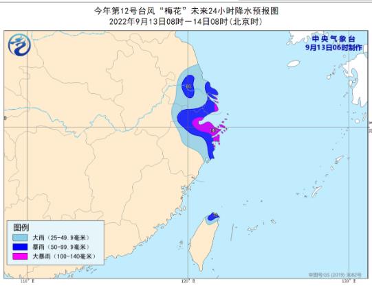降水預報:9月13日8時至14日8時,台灣島北部、浙江北部、上海、江蘇東(dong) 南部等地將有大到暴雨,其中浙江東(dong) 北部和上海等地的部分地區有大暴雨(100-140毫米)。