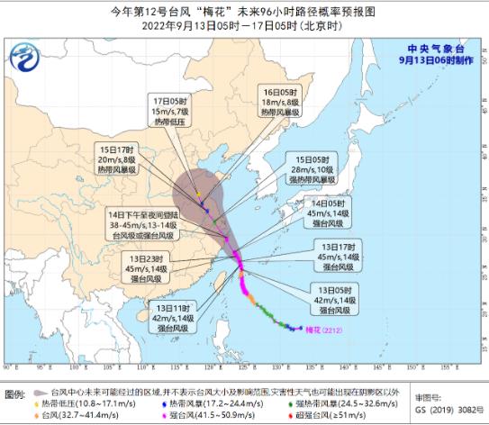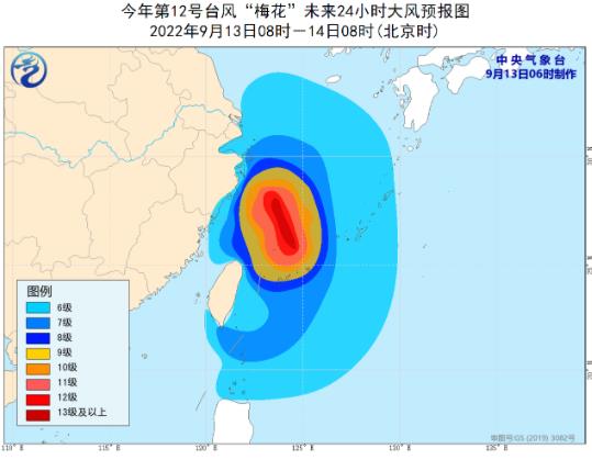 大風預報:9月13日8時至14日8時,巴士海峽、台灣海峽北部、台灣以東(dong) 洋麵、黃海西南部海域、東(dong) 海大部及釣魚島附近海域、長江口區、杭州灣以及台灣島北部和東(dong) 部沿海、浙江沿海、福建北部沿海、上海沿海、江蘇東(dong) 南部沿海將有6-8級大風,陣風9-11級,其中東(dong) 海部分海域將有9-11級大風,陣風12-14級,“梅花”中心經過的附近海麵的風力有12-14級,陣風可達15-16級。