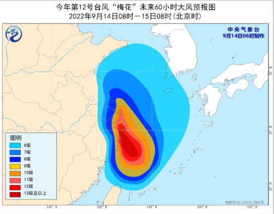 大風預報:9月14日08時至15日08時,東(dong) 海大部及釣魚島附近海域、黃海中南部海域、長江口區、杭州灣以及台灣島北部沿海、福建北部沿海、山東(dong) 南部沿海、浙江東(dong) 部、上海、江蘇東(dong) 部沿海和地區將有6-8級大風,陣風9-11級,其中東(dong) 海中西部海域、浙江中北部沿海、上海沿海、江蘇東(dong) 南部沿海、杭州灣、長江口區將有9-11級大風,陣風12-14級,“梅花”中心經過的附近海麵或地區的風力有12-14級,陣風可達15-16級。