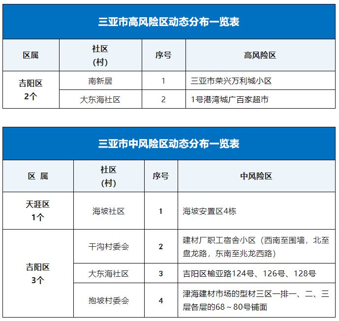 9月19日,記者從(cong) 海南省三亞(ya) 市新型冠狀病毒肺炎疫情防控工作指揮部獲悉,根據當前三亞(ya) 市疫情防控工作需要,按照國務院應對新型冠狀病毒肺炎疫情聯防聯控機製綜合組《新型冠狀病毒肺炎防控方案(第九版)》相關(guan) 規定,經專(zhuan) 家組研判,三亞(ya) 市疫情防控指揮部決(jue) 定,將紅旗街社區椰風巷79、81、83號樓等區域調整為(wei) 低風險區,自通告發布起,高風險區調整為(wei) 2個(ge) 、中風險區調整為(wei) 4個(ge) (見附表)。除高、中風險區外的區域為(wei) 低風險區。