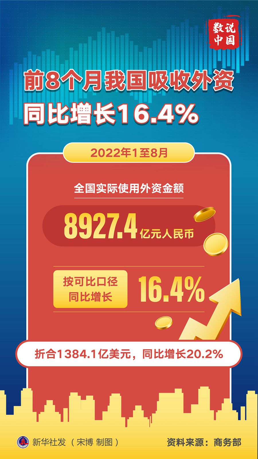 新華社北京9月19日電 (記者 謝希瑤)記者19日從(cong) 商務部獲悉,2022年1至8月,全國實際使用外資金額8927.4億(yi) 元人民幣,按可比口徑同比增長16.4%(下同),折合1384.1億(yi) 美元,同比增長20.2%。