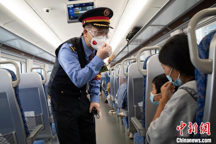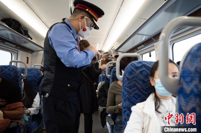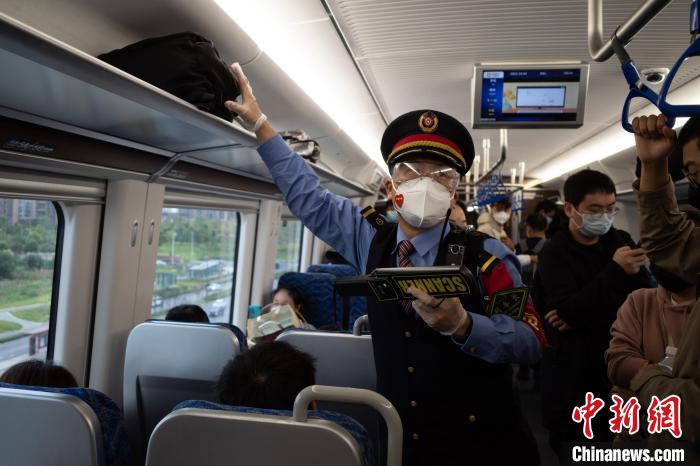 “請保管好自身財物,看管好小孩,照顧好老人,上下車注意腳下安全。”數百名乘客陸續上車後,鍾靜開始在車廂裏巡視。疫情防控期間,他要提醒大家戴好口罩。遇到行李架上行李擺放不規範,他要動手整理。同時,他還負責整列4節車廂的查票、補票工作。