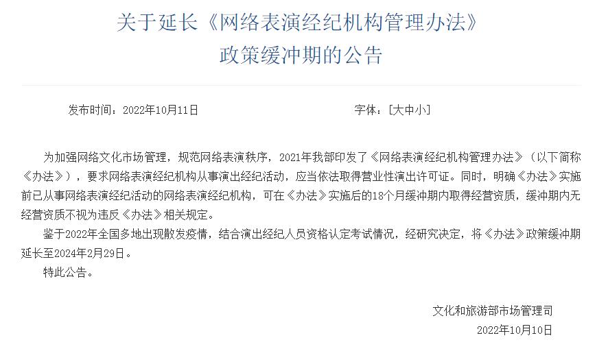 文旅部:延長《網絡表演經紀機構管理辦法》政策緩衝期